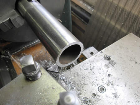 厚み約5mmのパイプを旋盤で引き、ビームの内径に合わせます。