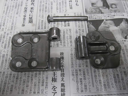 高年式のドアヒンジからピンを抜き、ブラスト処理をしてプレスイン!