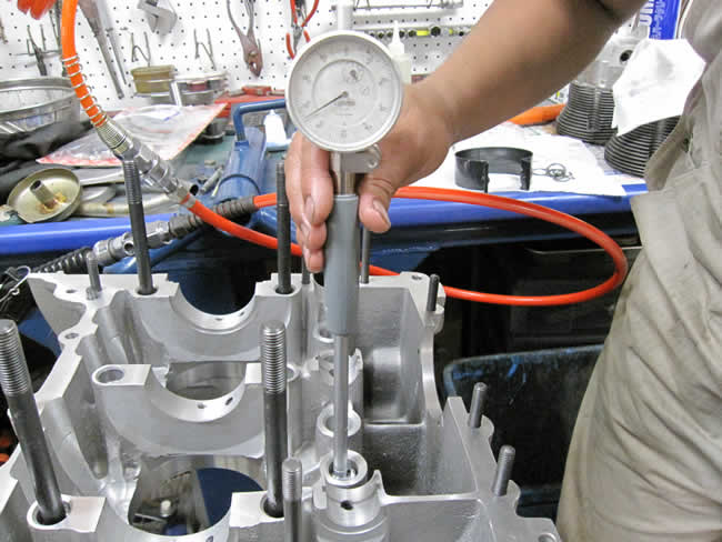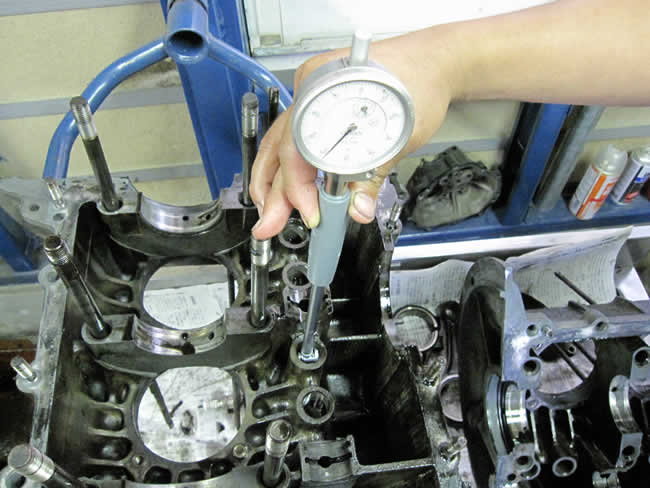 分解したエンジンパーツをチェックしています。