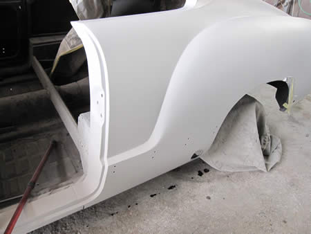 すでに張り替えが完了しているフロントフェンダー下からロッカーパネル、クォーターパネルまでのボディーラインはこんな感じです!
