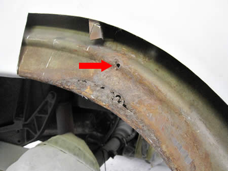 フェンダー上部のプレスライン付近にもドリルの穴がありました…いったい何をやった跡なんでしょうかね・・・。