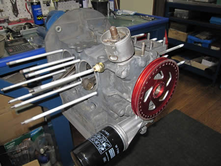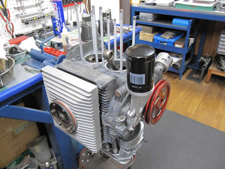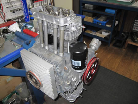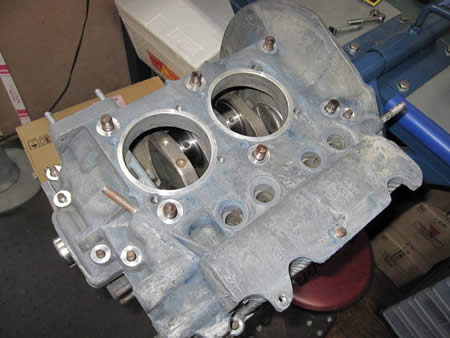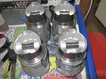 ショートブロックまで組み上がったケースに、ピストン&シリンダー、ヘッドを組み付けています。