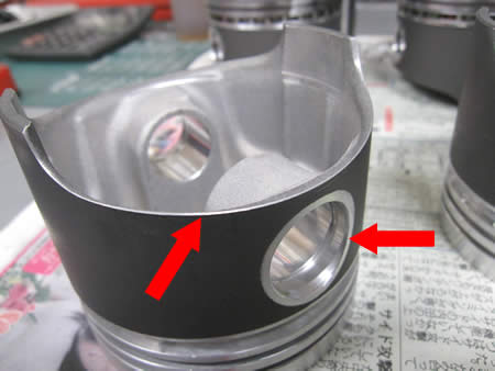 ピストンのアチコチにバリがあります(赤矢印)