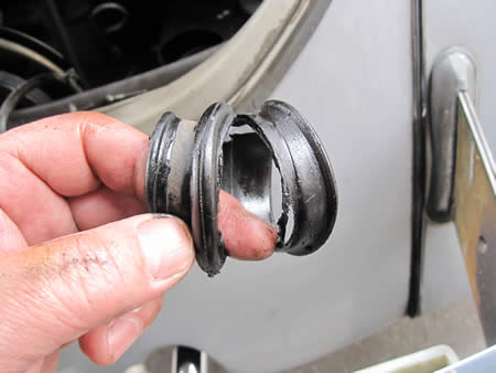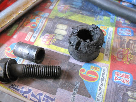 写真右は“崩壊”寸前のステアリングダンパーのブッシュ・・・ダンパー本体もスッカスカ♪に抜けてました・・・。