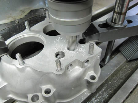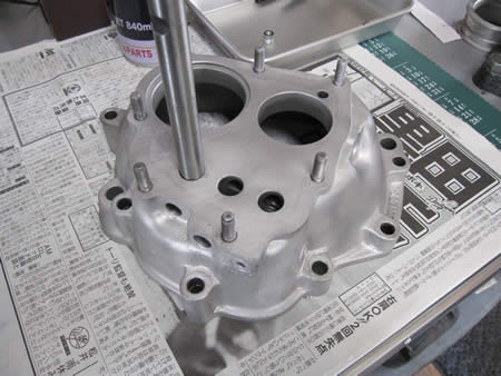 続いてミディエイトハウジングの摩耗したシフトロッドホールを一回り大きく切削します。