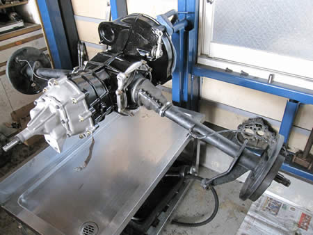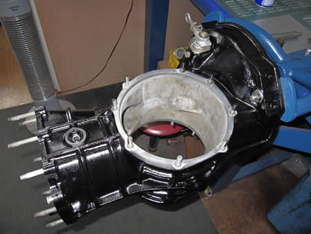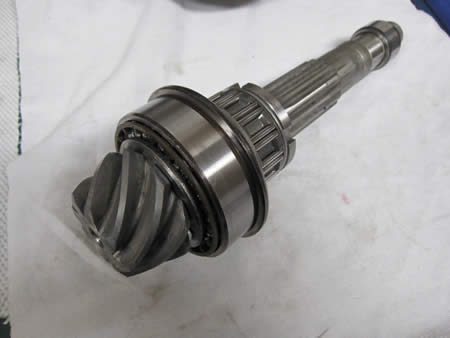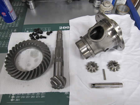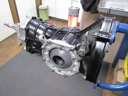 キレイに洗浄&ペイントしたミッションケースに、写真右まで組み上げたピニオンシャフトをセットします。
