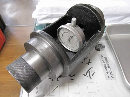 専用TOOLにダイヤルゲージを仕込み、写真中央のように“たまねぎ”までの距離を測定。