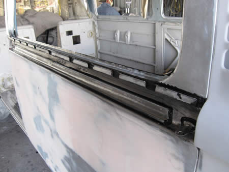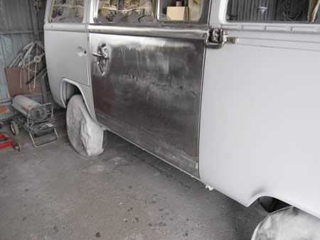剥離が完了したスライドドアをボディーに仮付けし、ボディーとのチリを確認しています。