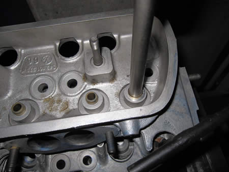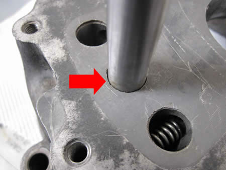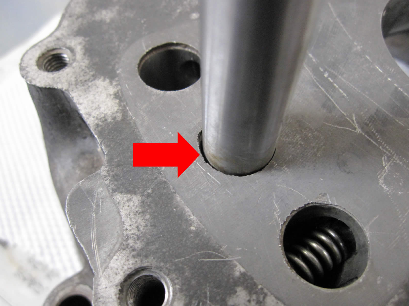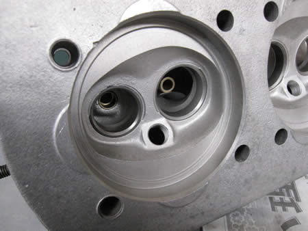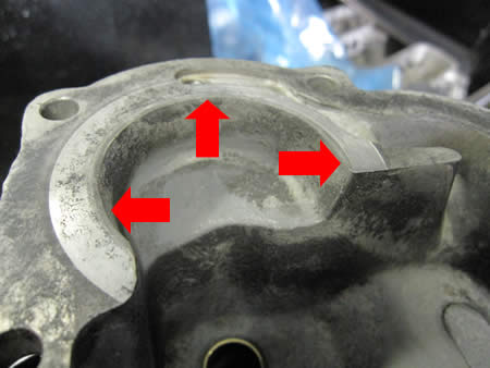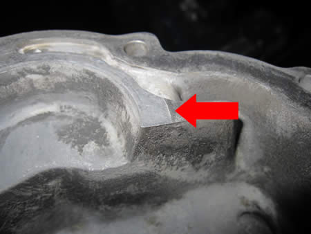 洗浄後にブラスト処理したシリンダーヘッドをチェックしますと・・・シリンダー座面に腐食による凹みがありました・・・(赤矢印)