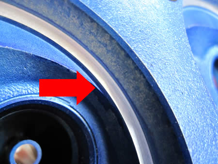 ピニオンギアの当たりを点検すると、先当たりの場所とヒール当たりの場所が・・・(赤矢印)