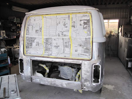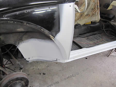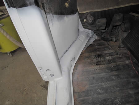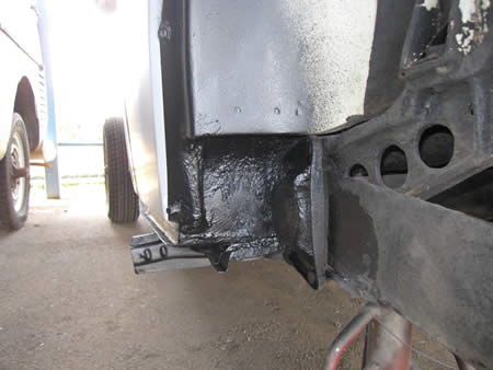 防錆処理後に組みなおしたサイドメンバー、合わせ目などに今一度防錆処理を行いサフェーサーを入れました。