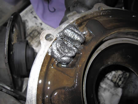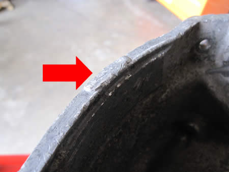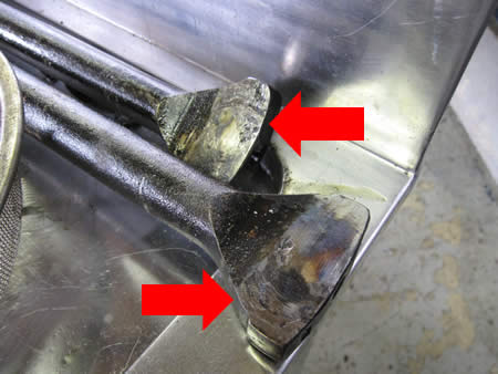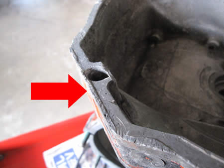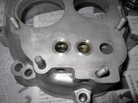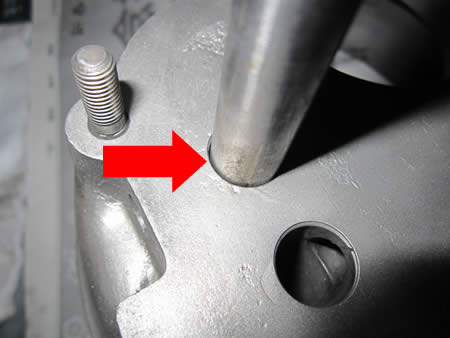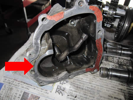 しかし・・・ミディエイトのシフトロッドの穴には摩耗が多く、そのままでは組み付けができませんでした。(写真赤矢印部)