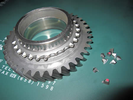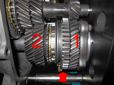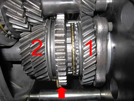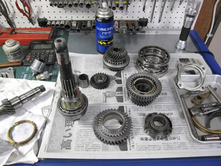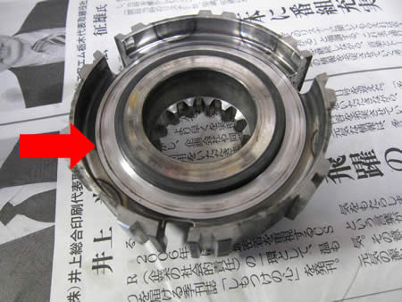 先ずは1stギアから点検すると、ハブのギアに片摩耗が・・・いつもの裏ワザです。