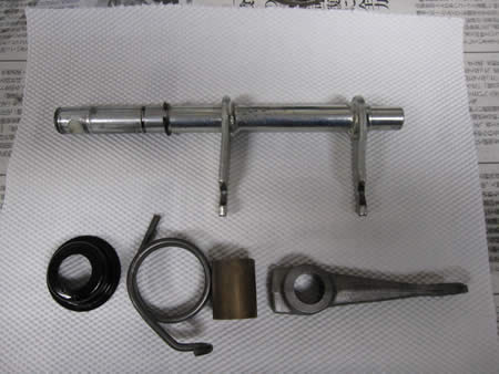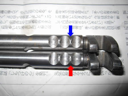 写真左の矢印部分「シフトロッド」と言いますが、赤より青い方のすき間が広いのがお判りいただけます?3か所の溝が少しずつ広がっているんです。