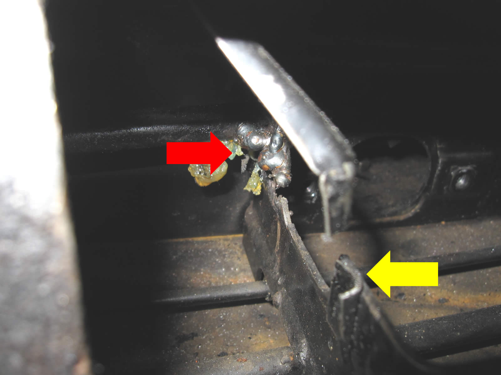 写真右の「黄色→」は破断したステーで、ここは溶接していなかったようです。