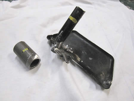 グチャグチャに付いていた溶接をきれいに削り、シェープアップしたステー!そしてガイドチューブの接続にはひとまわり大きなパイプを外側に被せて溶接します。(写真右)