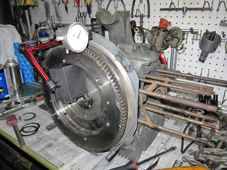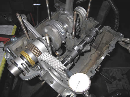 コンプリートに組み上がったクランクシャフトをケースに組み込み、カムを入れてギアのバックラッシュを測定。測定値は0.01mm合格です!!