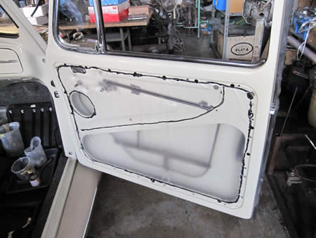 ベントウィングを組み付け、ドアパネルの裏側にビニールを張ります。