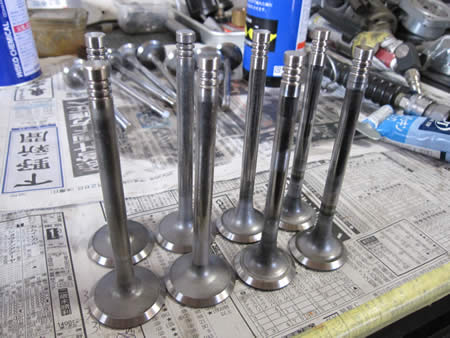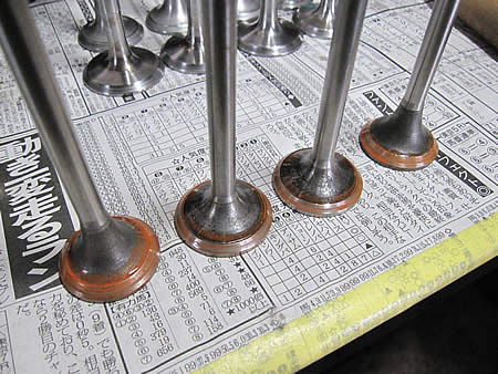 写真右は、バルブフェース&ステムエンドの研磨が仕上がった純正IN&EXバルブです!
