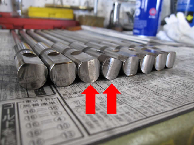ちっちゃいエンジンのプッシュロッド&リフターは一体構造になっているのですが、写真中央の→部分に摩耗がでています。ちょうど真ん中の部分が平たくなっているのがお判りいただけますでしょうか?