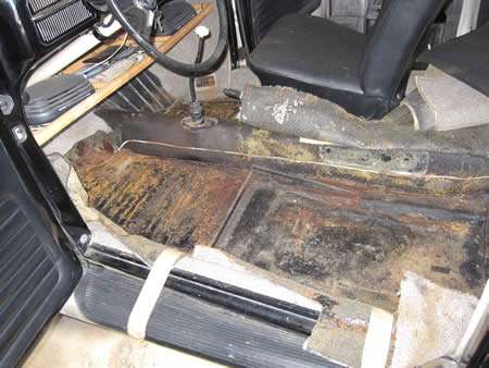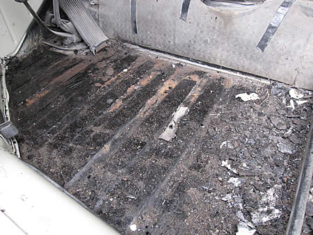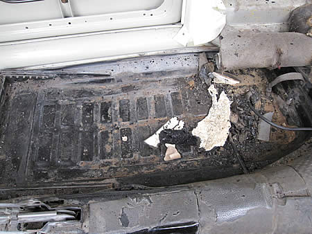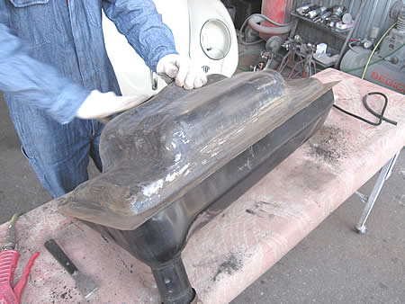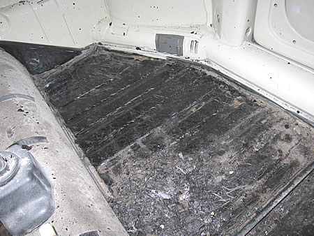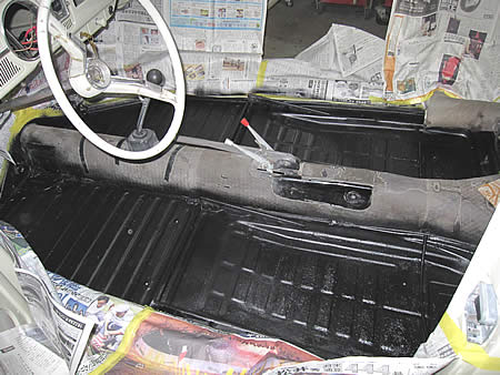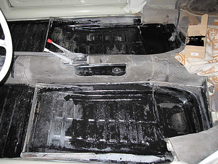 先ずは古い防音材を全て剥がして、きれいに清掃します。その後表面のサビをゴシゴシしてから「POR−15」を塗布、現在乾燥中です。