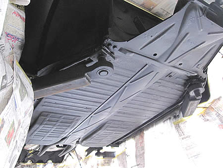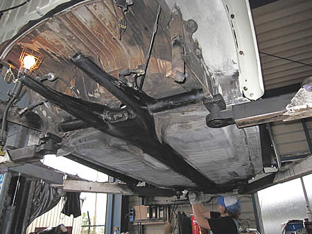 高圧洗浄機で取りきれなかった汚れをゴシゴシして、下廻りの防錆処理の準備です。