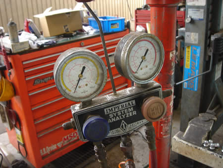 先ず真空ポンプで配管内の空気を抜き、しばらく放置プレー・・・(ゲージの針はマイナスです)。