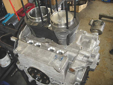 ピストン&シリンダーはすでに準備済みですから、チョイチョイ!?とロングブロックに組み上がりました!・・・と、ここで作業伝票を確認してみると・・・・ゲッ!オイルサンプ付けるの忘れてた・・・。