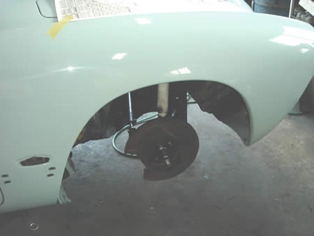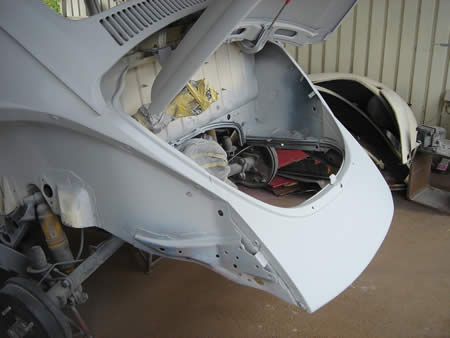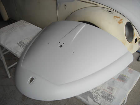フロントエプロンも剥離後に面修正を行い、サフェーサーが入りました。