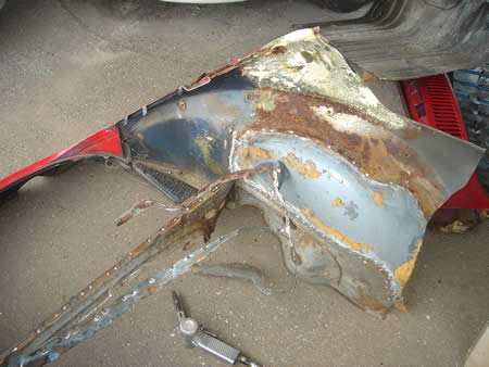 隠れていたダメージの程度を確認するため、部分的に剥離を行うと・・・やはりパテに隠れていた所はグシャグシャでした。