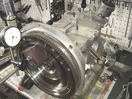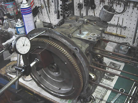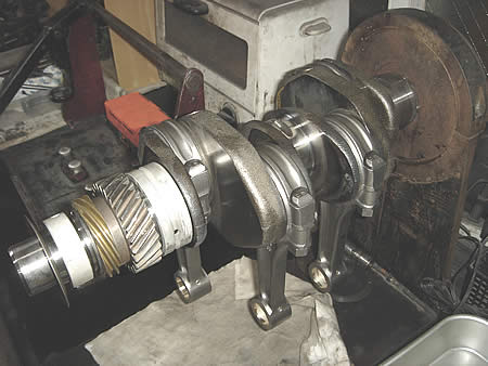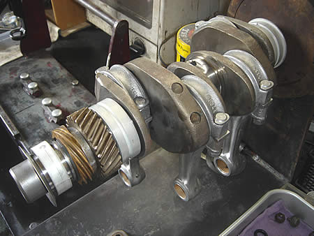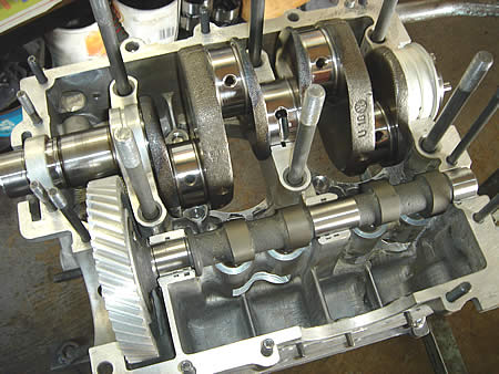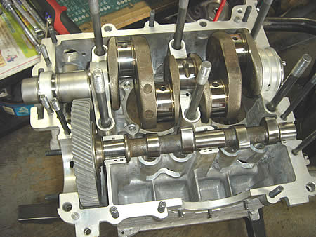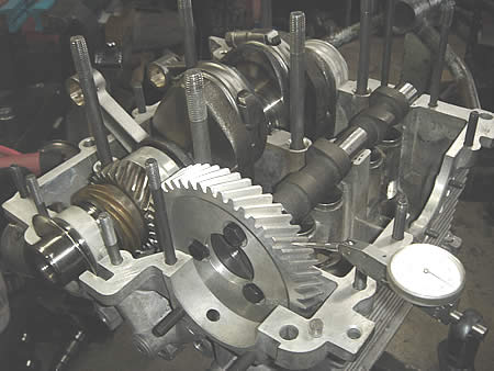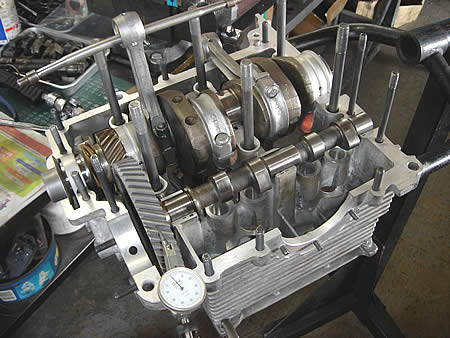 コンプリートになったクランクシャフトをケースに収め、カムシャフトを組み込んでギアのバックラッシュを点検してみると・・・続く。