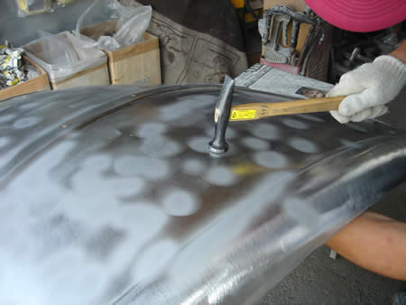 ノーズの部分には多少凹みがありましたので、たんねんに叩いて面を出していきます。