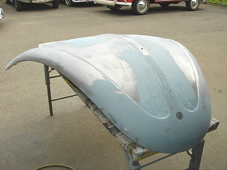 フロントフードの剥離が終わり、ブラスト処理を行っています。