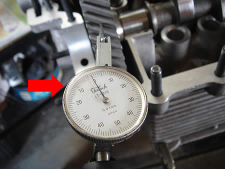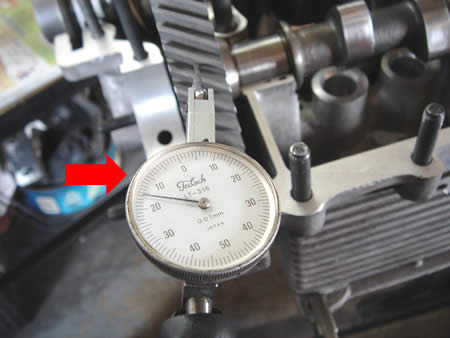 今回使用する純正カムシャフトは「カム山」の摩耗がほとんどありませんでしたが、ギアには・・・0.15mmのガタが出ています。