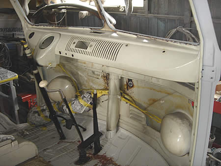 当初ペイントは行わないはずだったオリジナルペイントのダッシュ廻りも、ウィンドフレームの張替えにより溶接部分が室内にまで及び・・・已む無くペイントの準備です。