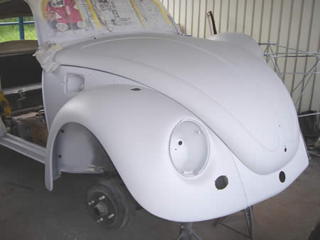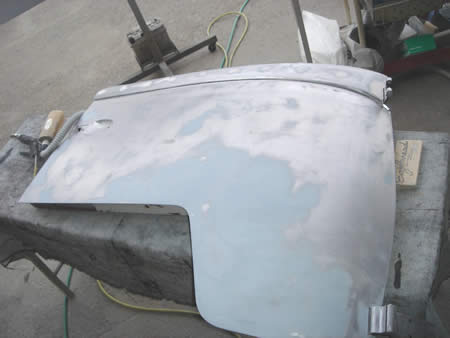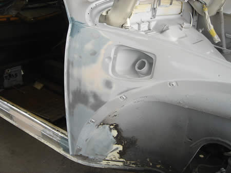 右フロントフェンダーは腐食が進んでしまっていたため交換になりましたが、そのまま使えるわけもなく・・・板金&面修正を行いサフェーサーを入れました。