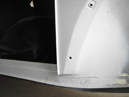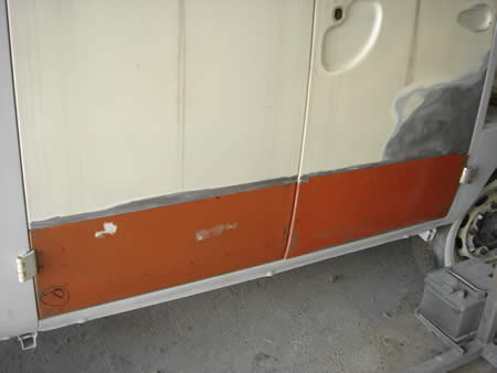 サイドカーゴドアには腐食によるサビ穴があり、切開&パネル張替えが必要です。