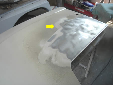 当初剥離を行わないつもりだったフロントドアでしたが・・・表面の塗膜にクモの巣状のひび割れがあり、ダブルアクションで一層目だけを削るよりも剥離したほうが早いだろうという事になりました。