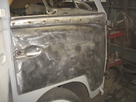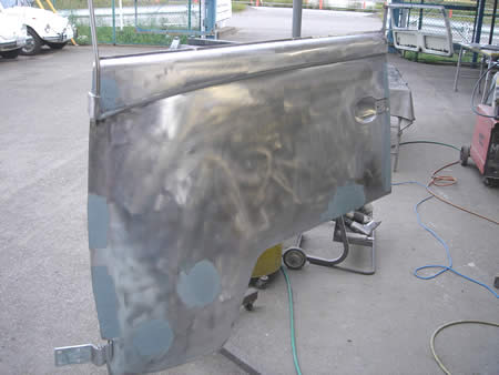 右ドアの溶接箇所を削り、面修正をしています。