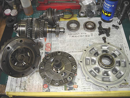 デフを外し、各シャフトからギアを分解して・・・ファイナルギアの歯数を数えると4.125でした。