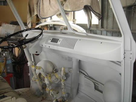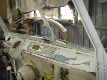 オリジナルペイントだったインパネまわりですが、フロントウィンドフレームを張り替えたため内側に溶接跡が残ってしまいペイントが必要になってしまいました。