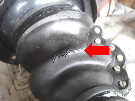 ミッションとアクスルチューブのジョイント部に付くアクスルブーツには亀裂があり、左右共に交換します。