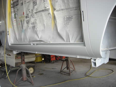 右ドックレッグからロッカーパネルまでも下処理が完了しサフェーサーが入りました。