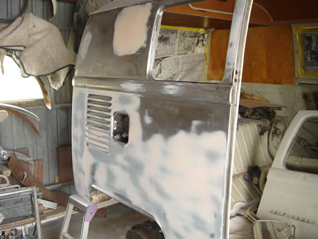 写真右は面修整のためのアルミパテを塗ったところです。