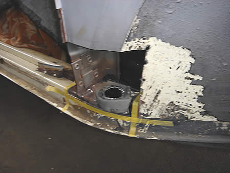 右Aピラーの付け根、サイドメンバーの切開&パネル張替えです。
