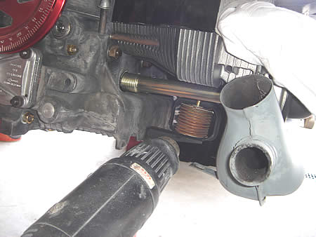 写真右はヒートガンでサーモスタットを暖め、開閉の作動確認をしているところです。