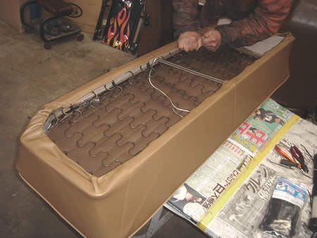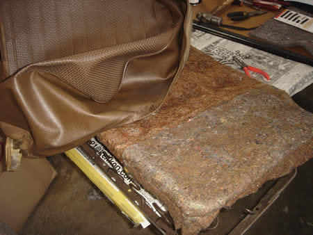 そして古いシートカバーの生地をスプリングとシートパットの間に挟み組み付けています。