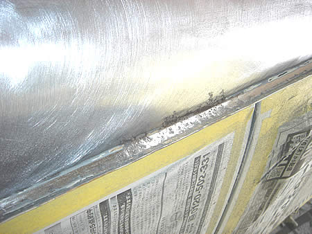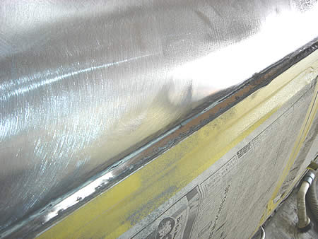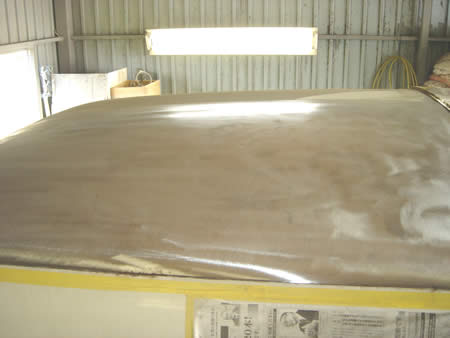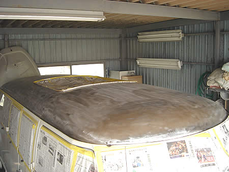 最近天候が不安定になり、鉄板を出したままにできなくなりました・・・さすがにこの大きな面を整形するには時間が掛かりますので、一度仮サフェーサーを入れてじっくり行います。