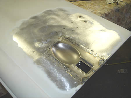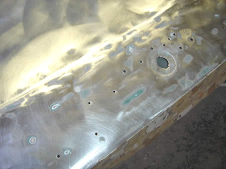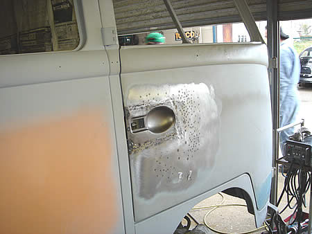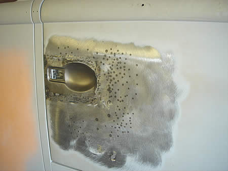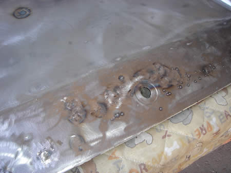 “アメリカならでは”の板金方法!?? ナンでもないパネルに穴を開けてパテを押し込む・・・パテが剥がれるのを防ごうという目的ですが・・・荒っぽいですね。