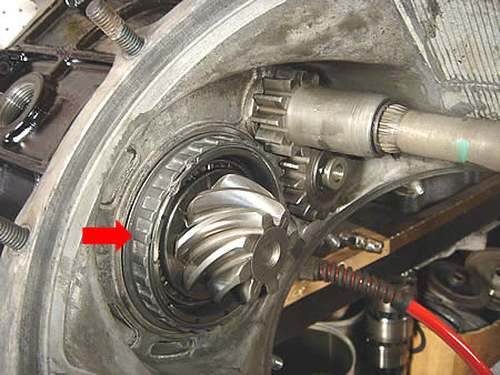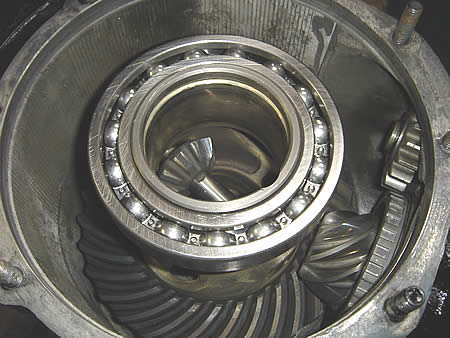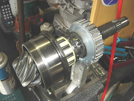 ピニオンシャフトにWテーパーベアリングを組み付けミッションケースに仮組みです。